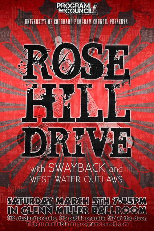 Poster and graphic for the Rose Hill Drive concert at CU Boulder in Spring 2011.